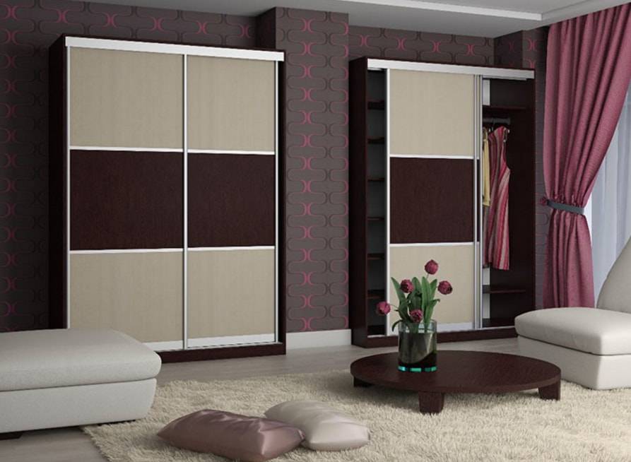 - двери-купе. Фасад выполнен из створок, которые перемещаются вдоль его линии по рельсам, пространство внутри шкафа полностью закрыто ими;