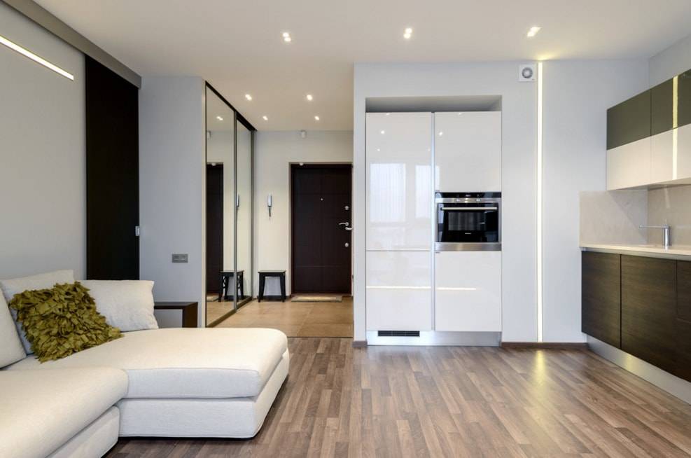 Пример ультрасовременного ремонта – и тут этот вид мебели уютно вписался в интерьер. Как видим, прихожая в этом помещении довольно скромная по размерам, и использование встроенного шкафа-купе более чем оправдано.