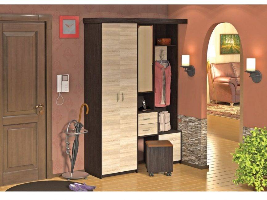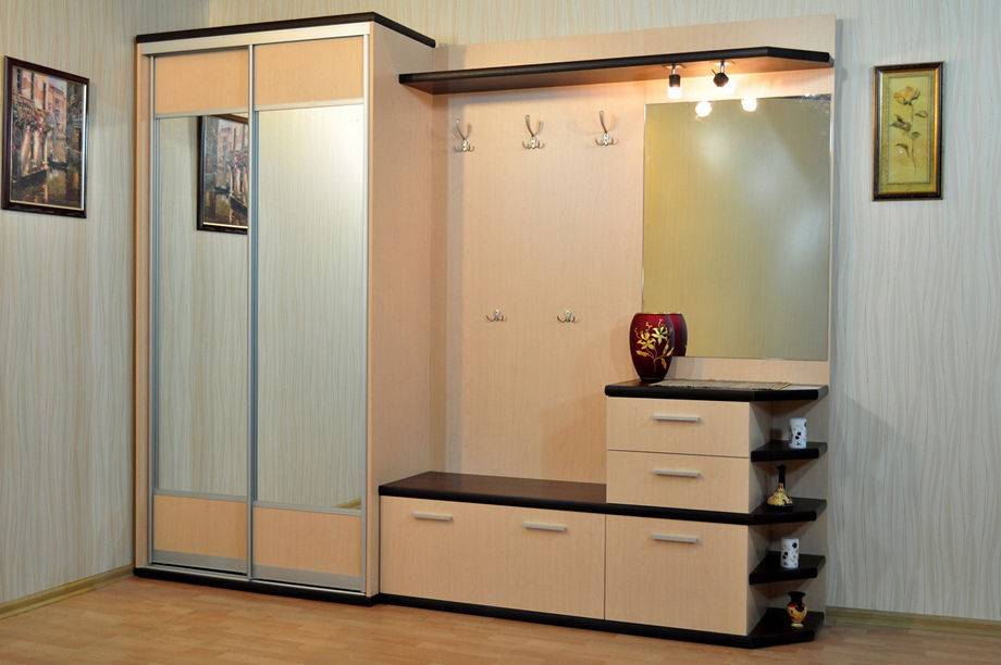 Включают в себя несколько предметов. Их можно объединить в одну композицию или установить отдельно. Обычно такой набор состоит из тумбочки, узкого шкафа, зеркала и вешалки.