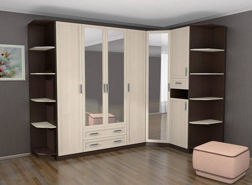 Г-образные представляют собой 2 корпуса, соединенные вместе перпендикулярно. Треугольная малообъемная конструкция повторяет форму угла. Она красиво смотрится в новых многоэтажках и однокомнатных «хрущевках». Многоугольные шифоньеры изготавливаются по индивидуальным размерам. Популярны 4-, 6-, 8-угольные модели.