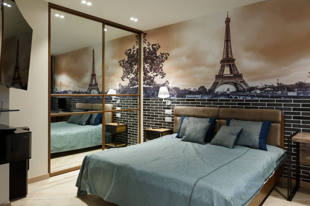На фото шкаф-купе с зеркальным фасадом в интерьере небольшой спальни в стиле лофт.