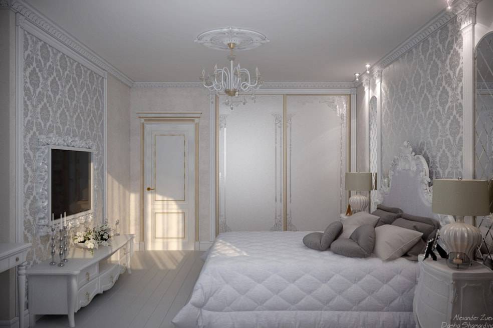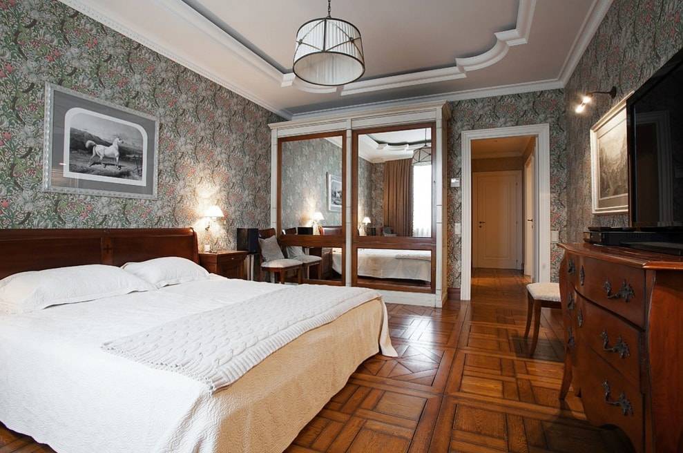 На фото спальня в классическом стиле со светлым шкафом-купе с зеркалом.