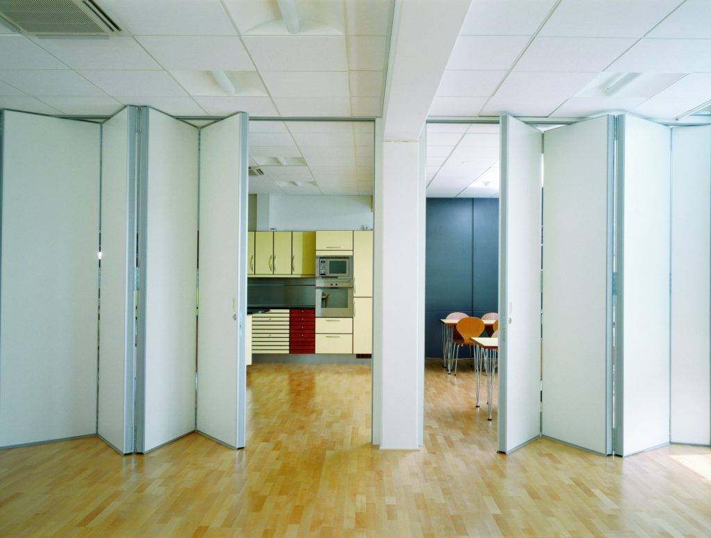 Учитывая, что при открывании все секции собираются ровную пачку, ширина которой не превышает габарита секции, могут не только закрывать дверные проёмы, но также выполнять роль трансформирующихся перегородок, перекрывая пространства протяжённостью до 3 – 4 м.