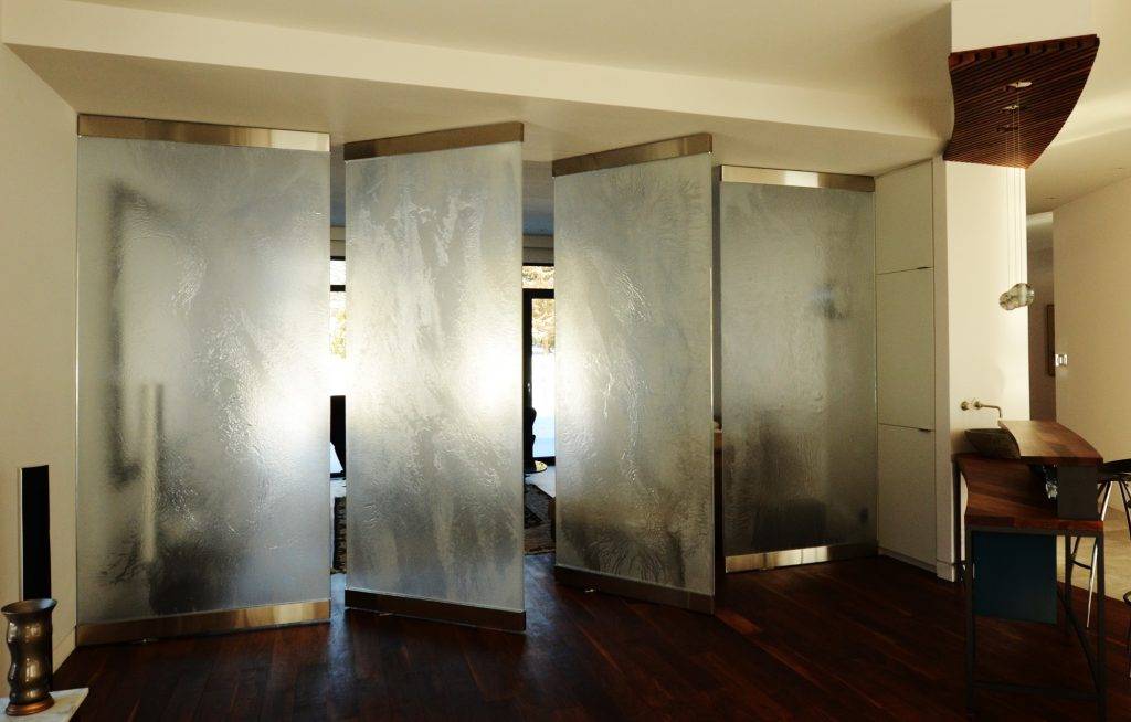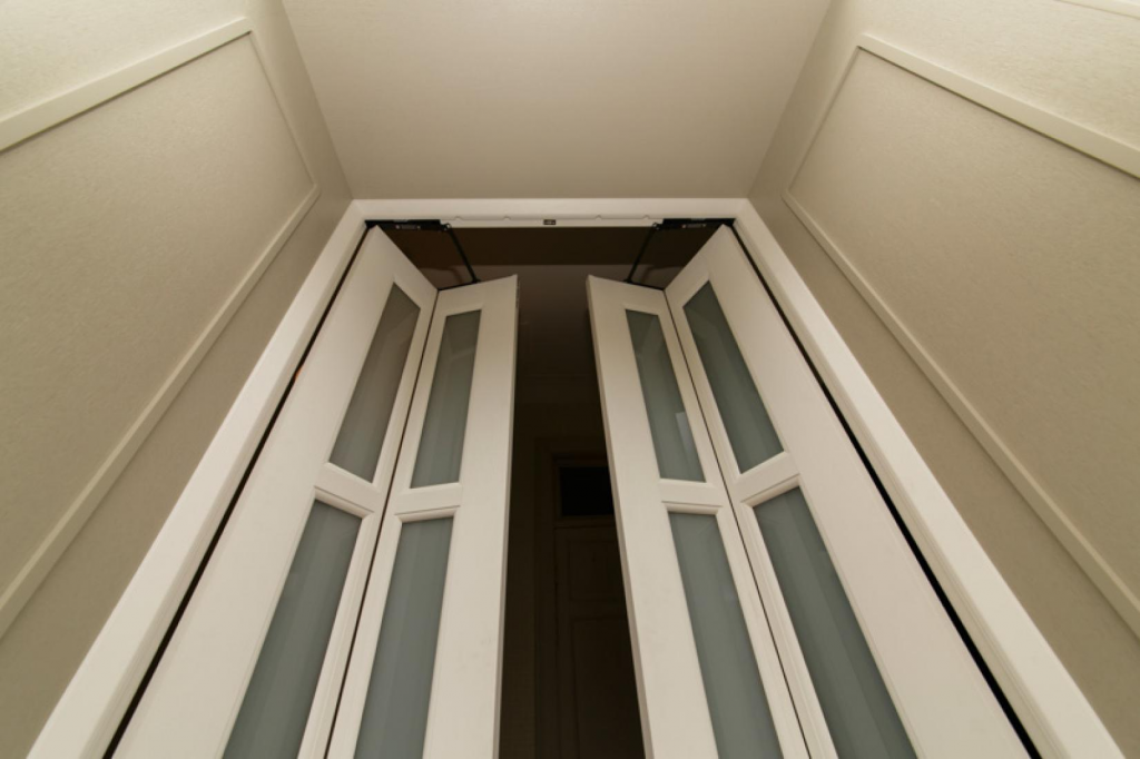 Высота складных дверей назначается заказчиком или дизайнером. В отличие от многих других конструкций, полотно может перекрывать пространства от пола до потолка, без необходимости организации дверной коробки и установки перемычки.