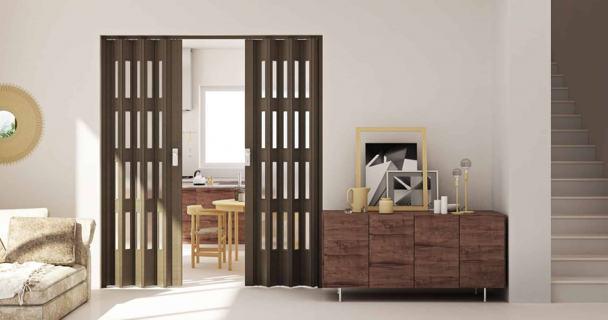 Складные двери для заполнения проёмов между смежными помещениями имеют ряд отличительных особенностей, по сравнению с классическими распашными конструкциями: