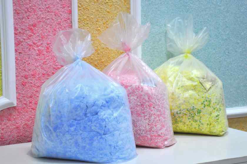 Как и все виды декоративной штукатурки, жидкие обои выпускаются в порошкообразном виде, который необходимо предварительно развести и замешать раствор. Он получается достаточно густым и вязким, а по консистенции напоминает творожную массу. Основное их отличие от штукатурки – разный состав смеси, в которую входят:
