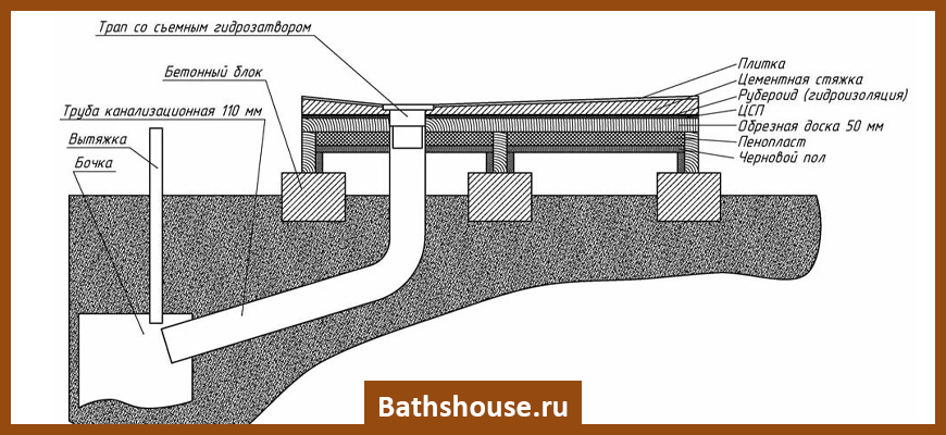 Обыкновенный слив с гидрозатвором в банях на свайном фундаменте пересыхает, а в комнаты проникает запах из септиков. При утеплении полов вместо обычного трапа рекомендуется использовать сток с сухим гидрозатвором.