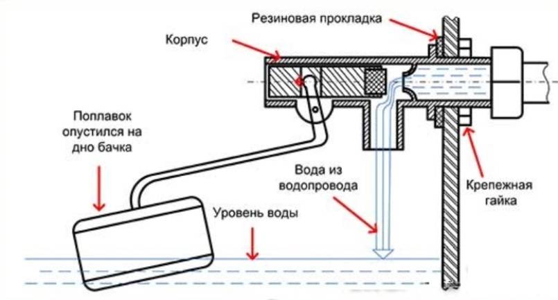 Он представляет собой клапан, который соединён с поплавком. Вода проходит сквозь клапан и, наполняя бачок, поднимает поплавок. Поплавок в свою очередь, при полном наполнении нажмет на клапан и перекроет подачу воды. После нажатия кнопки слива, поплавок вновь опускается вместе с уровнем воды и весь цикл повторяется. Рассмотрим, из чего состоит поплавок, как его смонтировать и отрегулировать количество воды, поступающей в бачок.