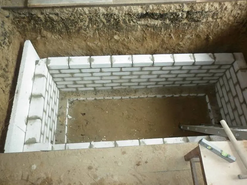 При достаточном количестве материала их можно класть в кирпич. Стенки при этом могут иметь толщину 12 или 25 см. Такие параметры следует учитывать во время разметки котлована. Для простоты работ следует выполнить точный чертеж конструкции
