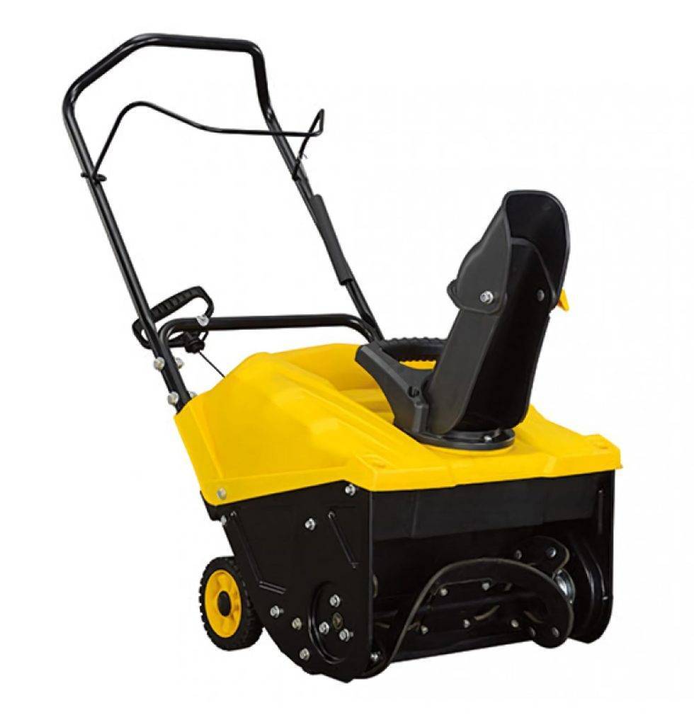 Для небольших участков лучше приобрести шнековый одноступенчатый снегоочиститель, работающий от электричества. Снег отбрасывается без применения дополнительных механизмов, а только за счёт центробежной силы самого шнека.