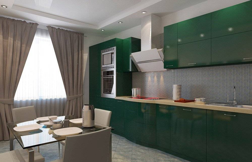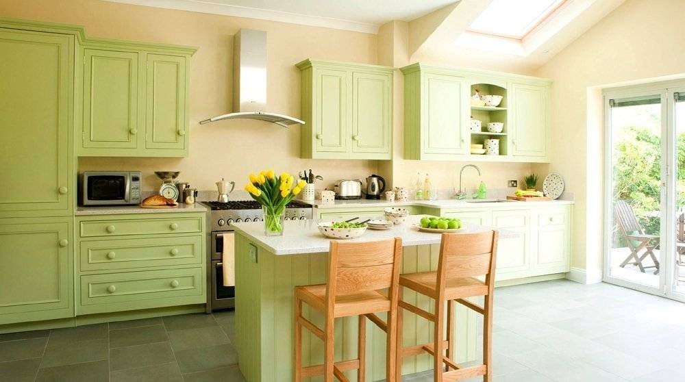 Зеленый. Насыщенный зеленый будет тяжело смотреться в качестве доминирующего фона, но более светлые его оттенки удачно гармонируют с белыми фасадами мебели, с молочными, кремовыми или светло-серыми элементами декора.