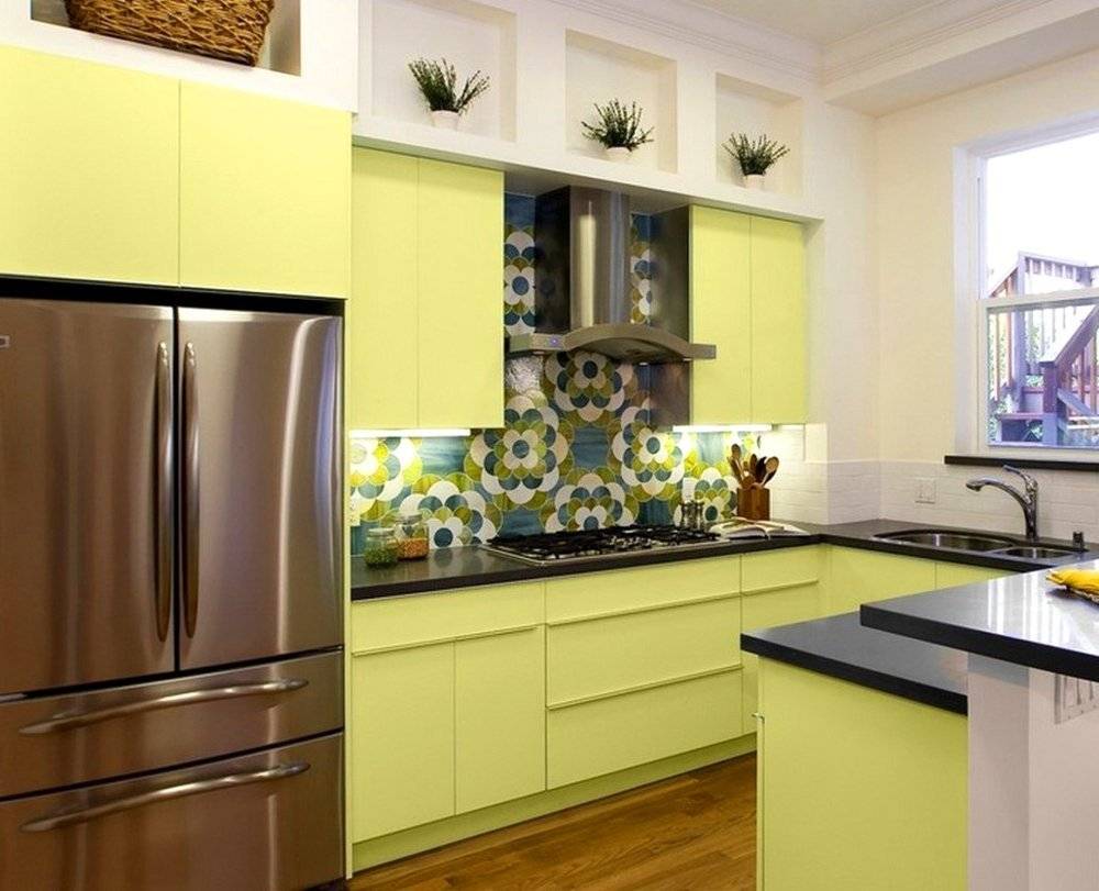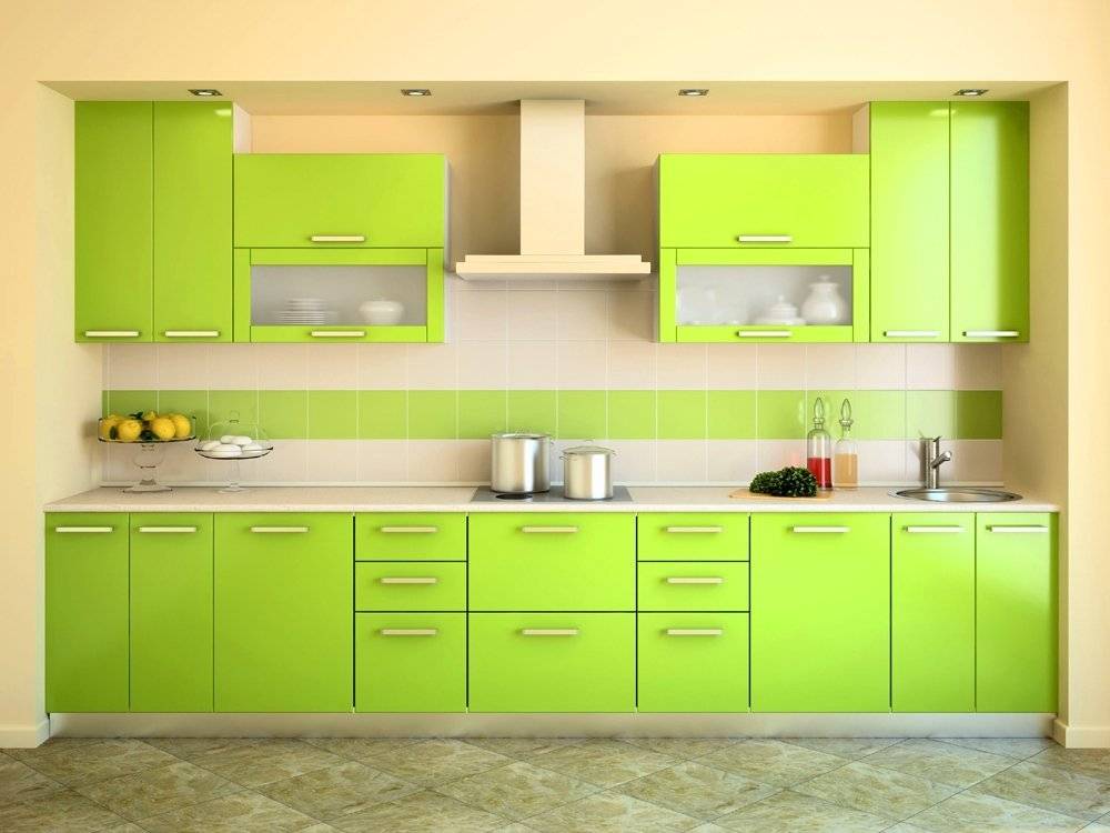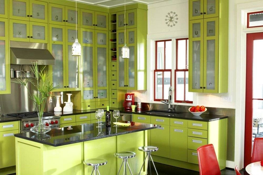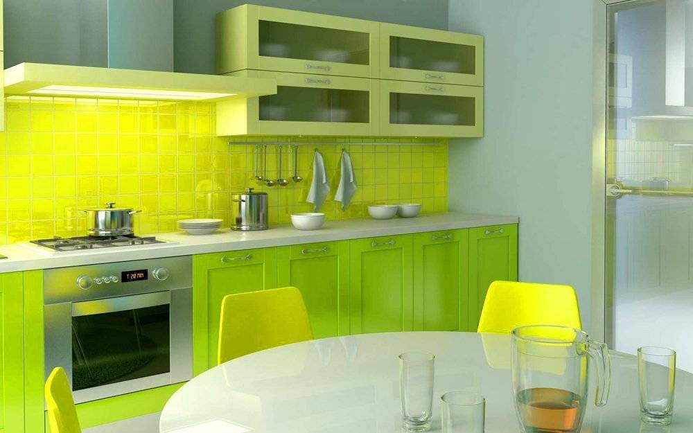 Для зеленого гарнитура с ярким фартуком следует выбирать нейтральный окрас стен и потолка. Играет роль и освещение: насыщенные и темные краски для северных комнат не рекомендованы.