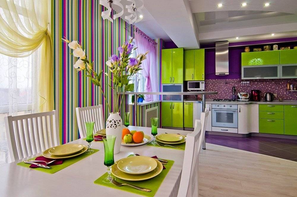 На фото салатово-лиловый интерьер с элементами поп-арт