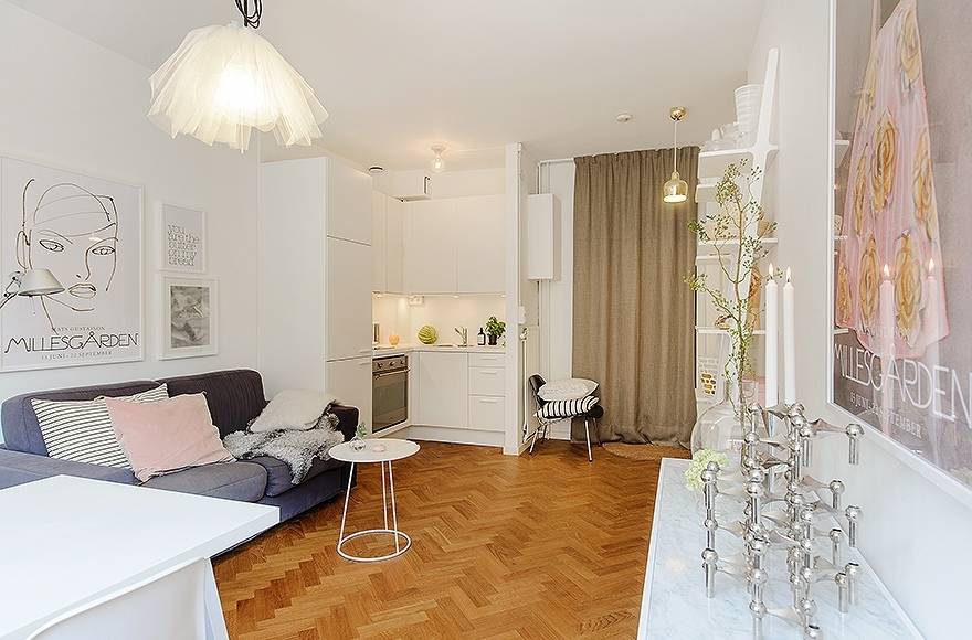 Компактная мебель поможет сэкономить место, а большое зеркало добавит объем помещению.