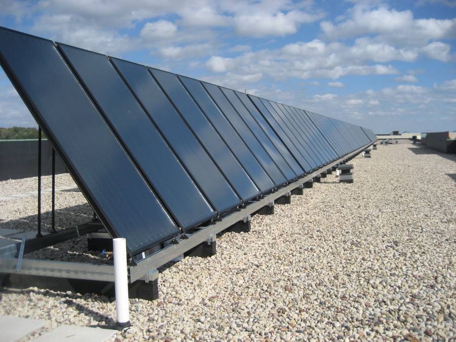 Солнечные коллекторы нагревают теплоноситель, который потом циркулирует в системе отопления дома, или нагревает воду для горячего водоснабжения.