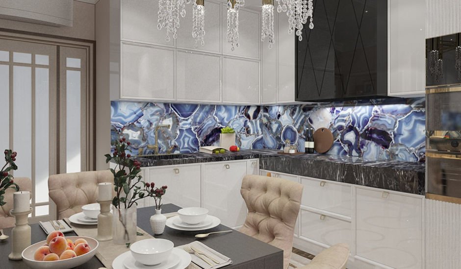 Одним из часто используемых материалов при оформлении фартуков и столешниц является мрамор. Его можно применять не только при отделке фартука и столешниц, но и при оформлении полов и стен.