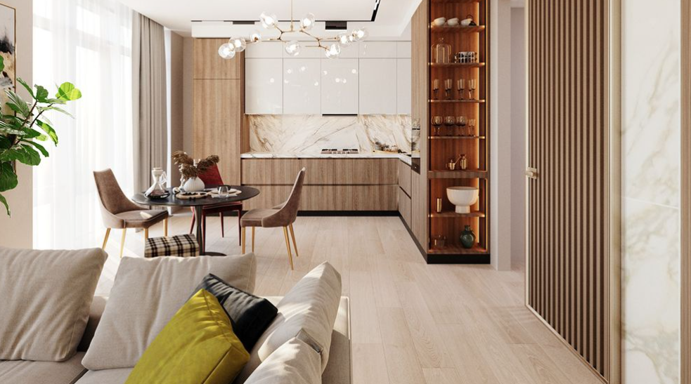 Для небольшой квартиры подойдет линейная планировка. Обеденная зона при такой планировке располагается в центре. Это делает квартиру более уютной и современной.