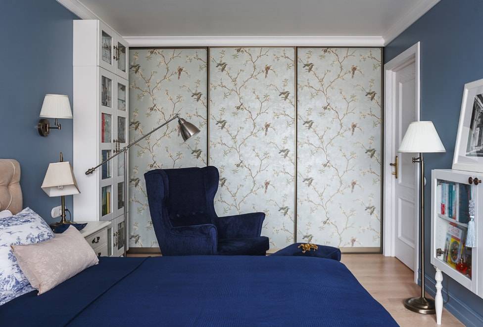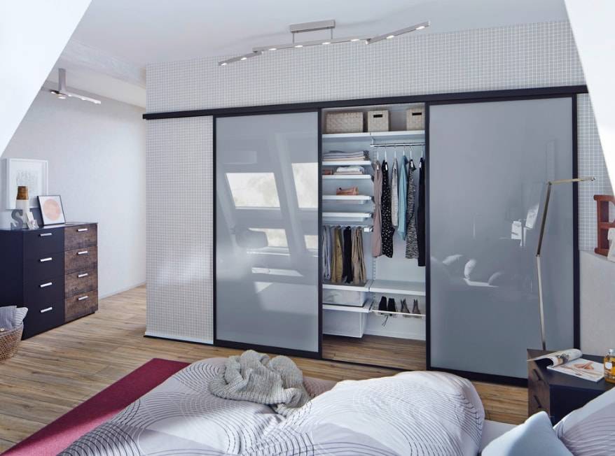 Для шкафа-купе в спальне хорошо подойдет отделка стеклом, шпоном или акриловыми панелями