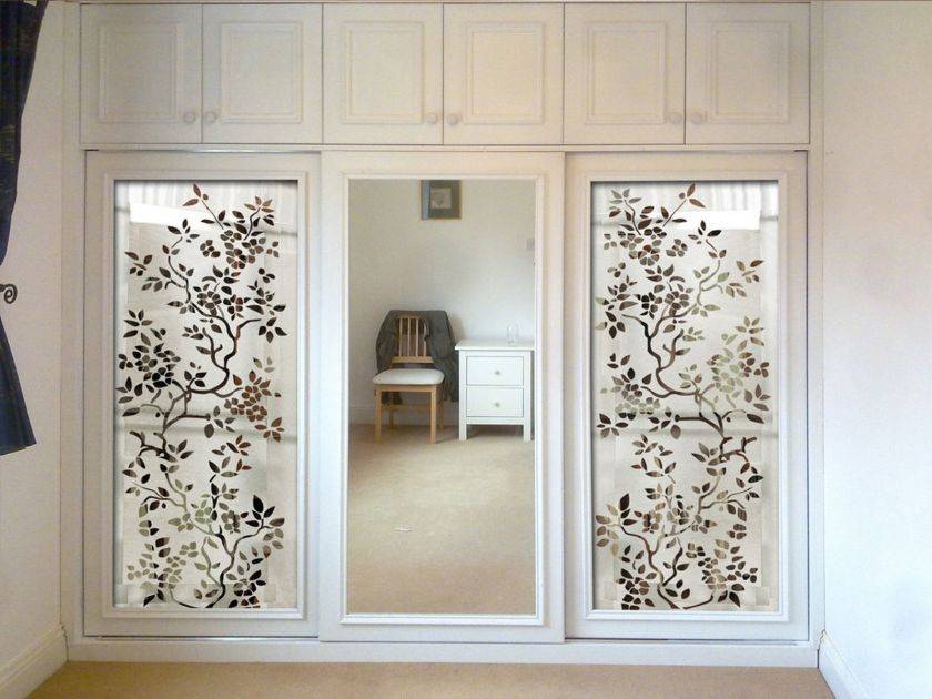 Дизайн шкафа купе выбирается индивидуально. Многие фабрики предлагают каталог витражных пленок с рисунками. К их плюсам относится: