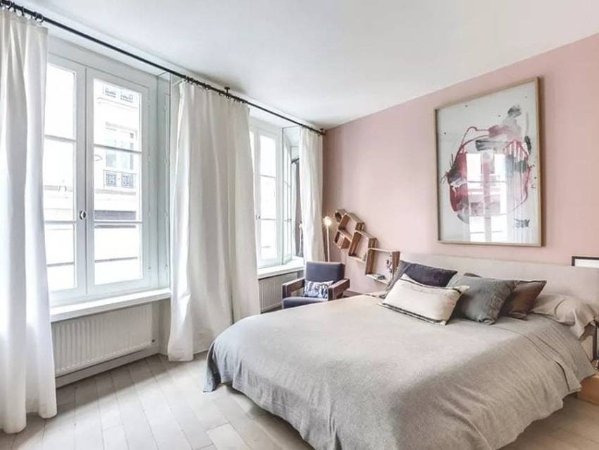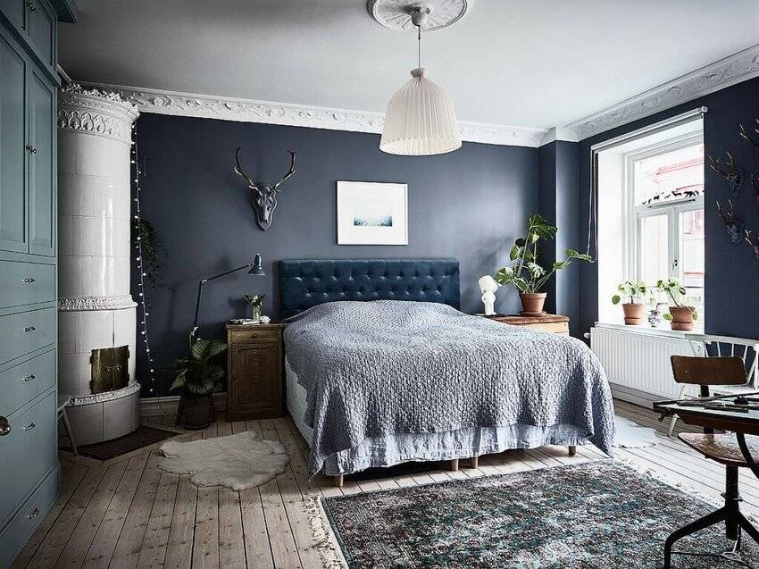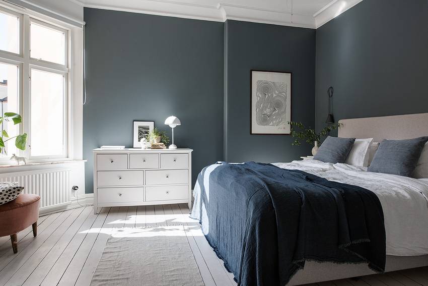 4. Цветная краска. Это наименее распространенный цветовой план. Если и привносят в спальню цвет, то, как правило, не яркий и не теплый. Обычно это дымчатые, пыльные или грязноватые оттенки синего и зеленого.