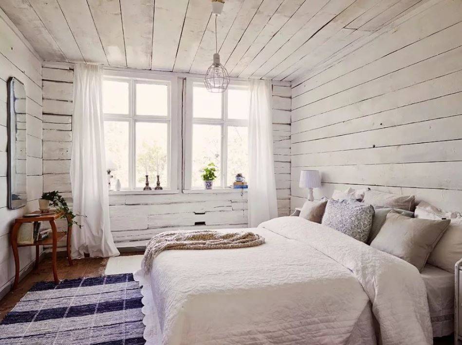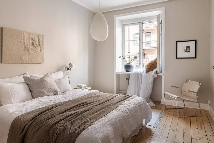 Белый цвет является традиционным для скандинавского интерьера и часто используется как базовый для покраски стен в спальне и отделки других поверхностей.