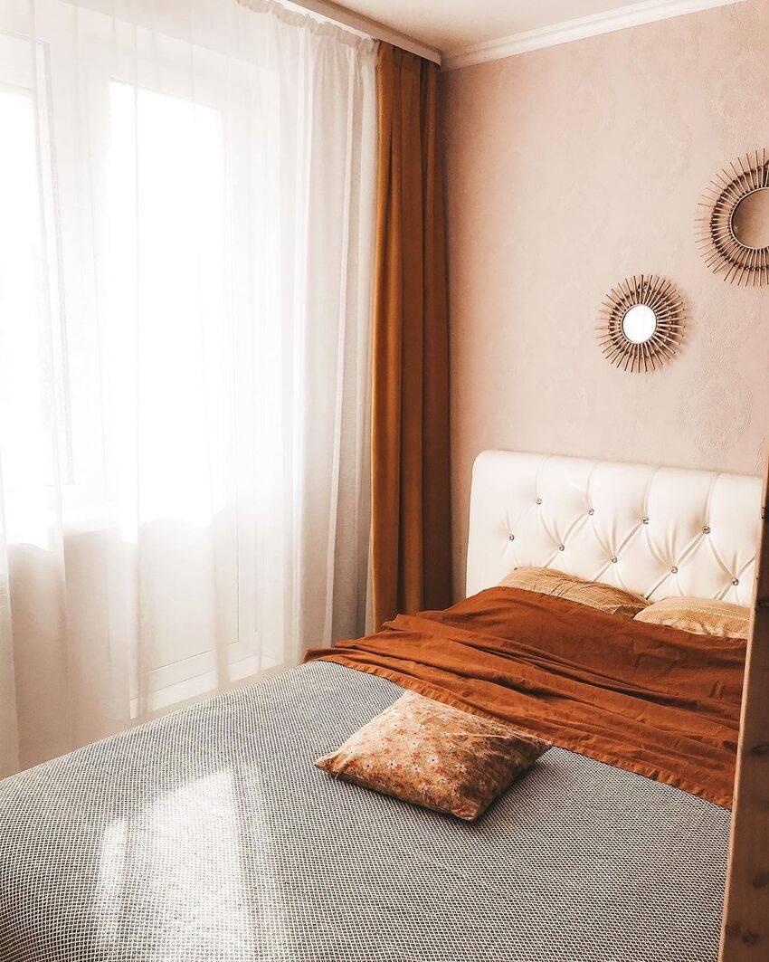 Расставлять предметы интерьера можно не только в классическом виде, но и отходя от шаблонов. К примеру, кровать, не придвинутая плотно к стене, а стоящая в центре спальни, смотрится стильно.
