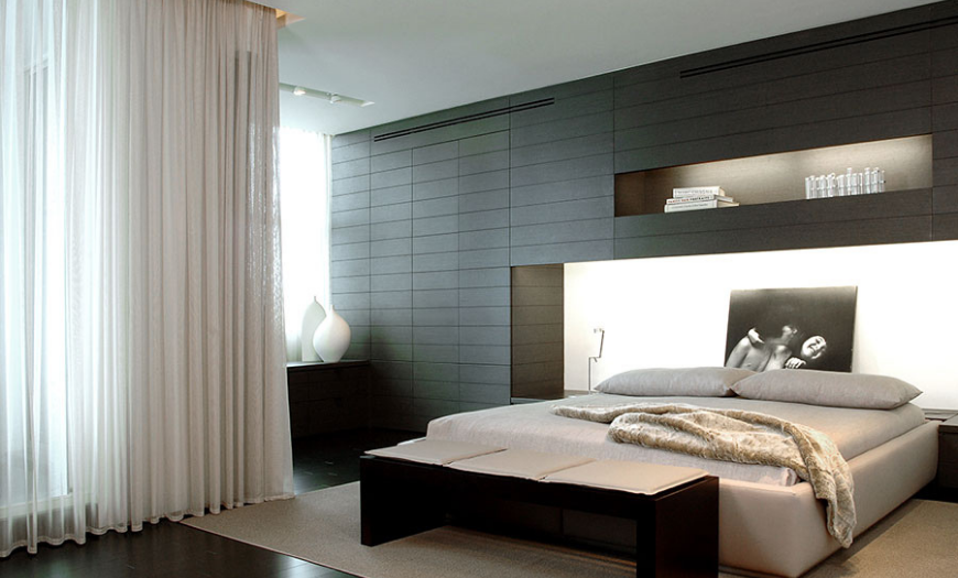 Выбирая кровать для спальни в стиле минимализм, стоит обратить внимание на простые модели с маленьким прямоугольным изголовьем или без него. Серый в дизайне спальни Источник www.luvne.com