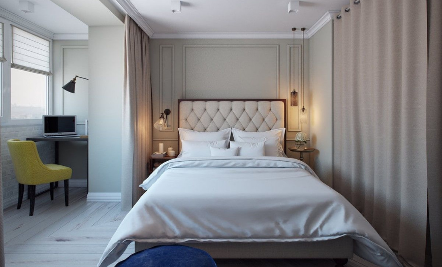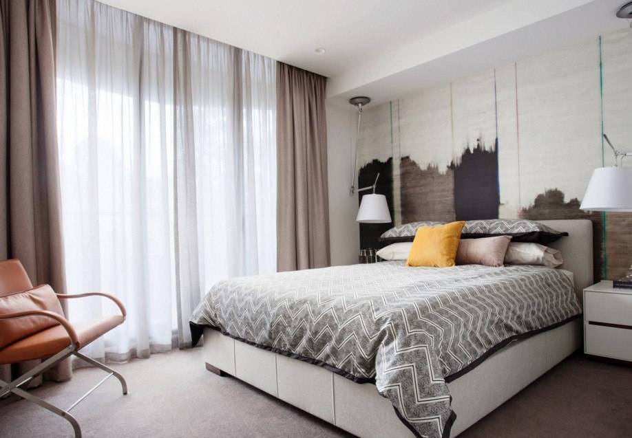 Еще один вариант мягко разделить пространство – шторы. При необходимости они сыграют роль перегородки, а в остальное время послужат дополнительным украшением спальни.