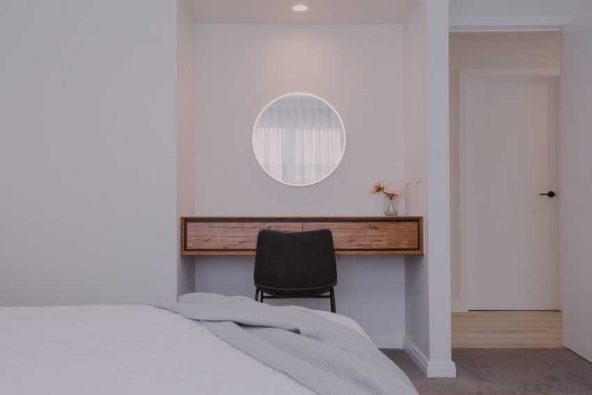 Для миниатюрных помещений спальный гарнитур можно брать не полностью. Основное — это кровать и шкаф или комод, а оставшиеся объекты можно исключить. Если же вы не можете без трюмо, то его можно спрятать в шкаф в отдельный отсек, но тогда сократится место для хранения вещей, поэтому нужно всё продумать до покупки.