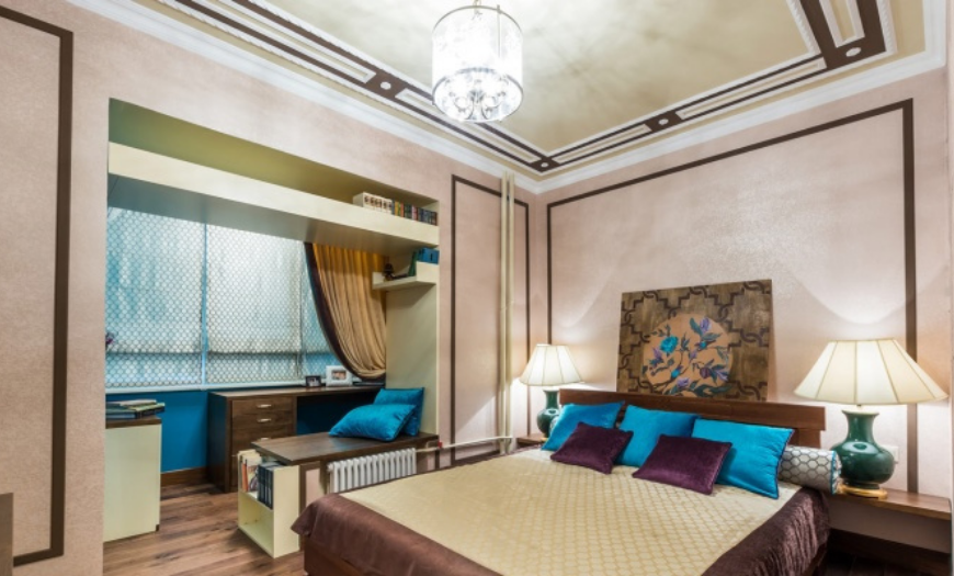 Хм, а эта спальня с современном стиле или в классическом? Нижняя часть фото, кроме светильников, явно говорит о современном стиле. А вот потолок, включая потолочный плинтус с лепниной и люстру, явно пришёл из стиля классического. Тут мы вспоминаем ещё одно правило сочетания стилей: