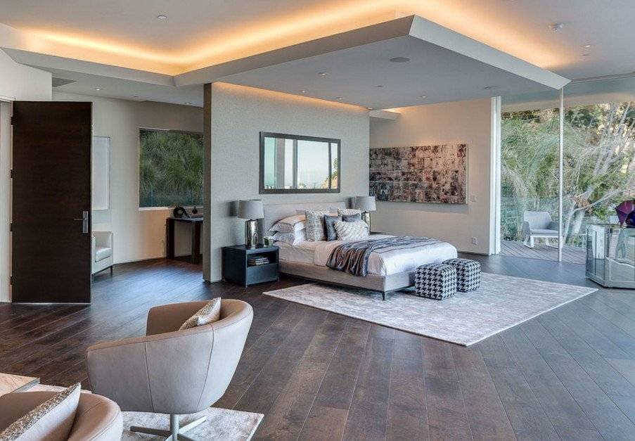 Верный друг всех современных интерьеров – натяжные потолки, которые идеально отражают концепцию самого стиля. Полотно может быть как глянцевым, так и матовым, а вот сатин, текстиль и фотопечать почти не используются. В просторных спальнях для зонирования и многоуровневого освещения хороши гипсокартонные коробы.