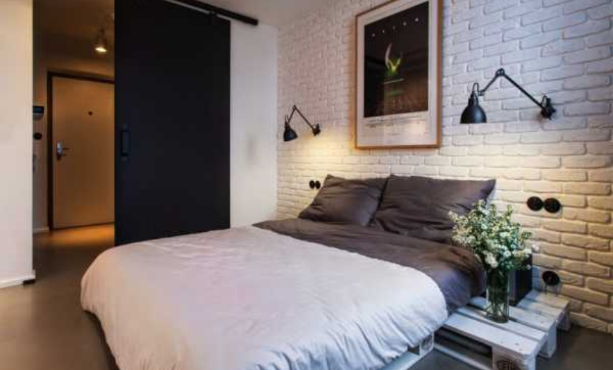 Стена за изголовьем часто делается акцентной – оставь кирпичную кладку, бетон или обшей ее деревянными панелями. Фотообои в современных интерьерах не слишком распространены. Если хочешь цветовой акцент – возьми темно-коричневую или темно-серую краску.