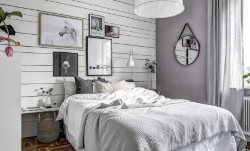 Отличительными чертами спальни в скандинавском стиле можно назвать нарочно грубую древесину и исключительно натуральные материалы. Комната получается светлой уютно и просторной. Для отделки стен зачастую используется краска светлых тонов, а в качестве напольного покрытия – ламинат. Оживить интерьер можно с помощью пушистых ковриков или лоскутных покрывал.