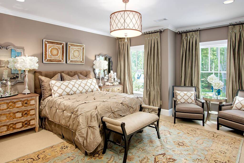 На фото: Коричнево-бежевая спальня с золотыми акцентами