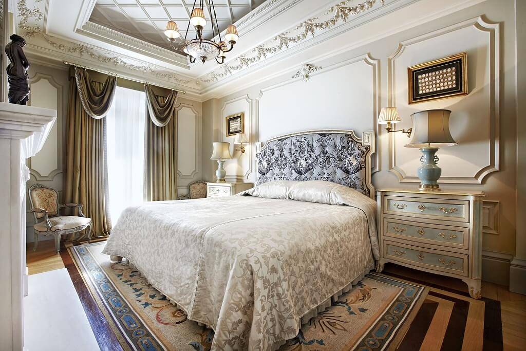 Драпировки из шелковых тканей, позолоченная лепнина на потолке, отделочные материалы с золотистыми рисунками – все это позволит добиться нужного уровня роскоши в декоре.