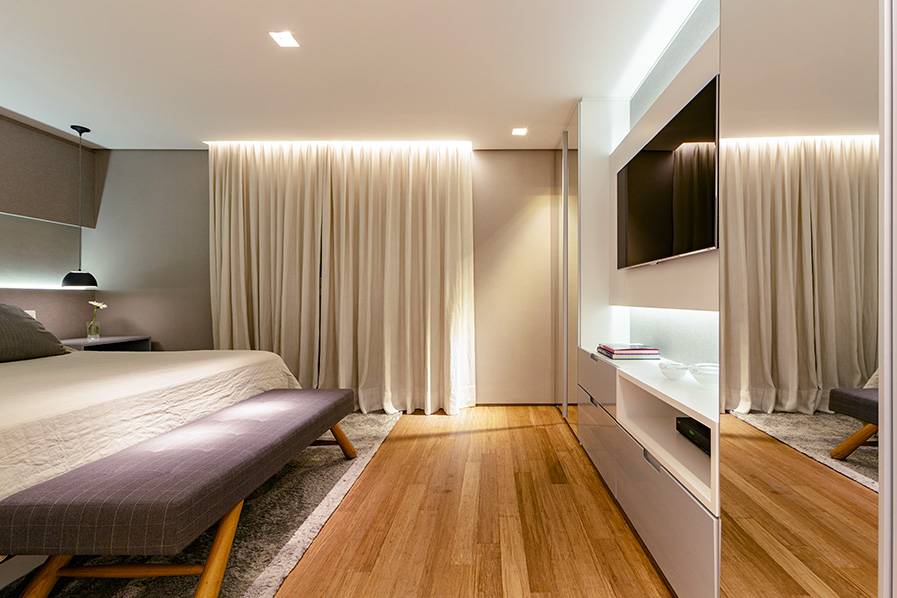 Другая мебель в спальне должна быть функциональной, с гладкой текстурой, простой и желательно в одном — двух приглушенных тонах. Лучше всего положить натуральный материал на пол, например, натуральные деревянные доски согревают интерьер спальни и делают его более уютным. Также, натуральные доски могут украсить одну из стен или стать эффективным продолжением изголовья кровати. Благодаря этой обработке вы получите характерный акцент без добавления лишних предметов.