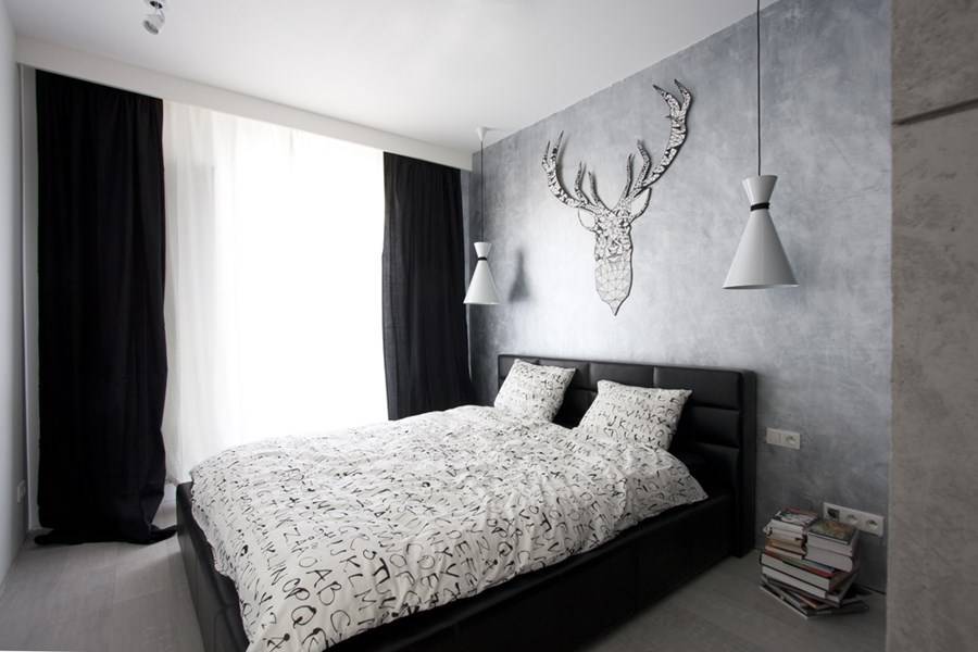 Подобное лаконичное и немного строгое оформление с отсутствием дополнительных декоративных элементов в виде рюша, кружева и прочего, особенно подходит для спальной комнаты холостяка. В мужском минимализме применяются максимально функциональные детали в сочетании с отделкой, выполненной в шоколадных, кофейных, серебряных, стальных или черно-белых тонах.