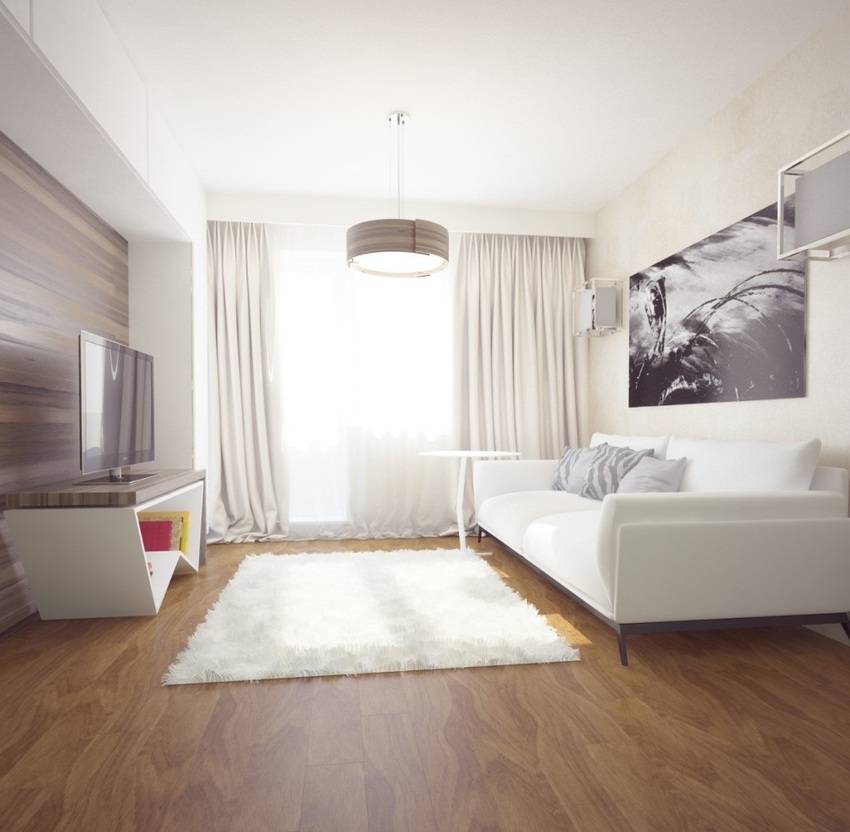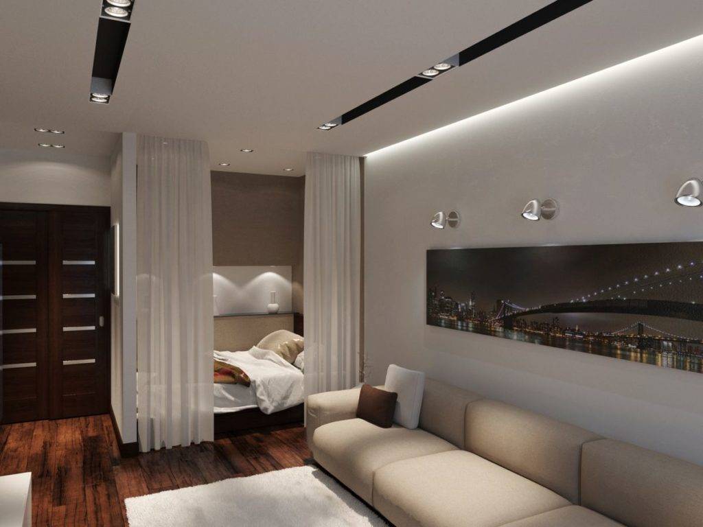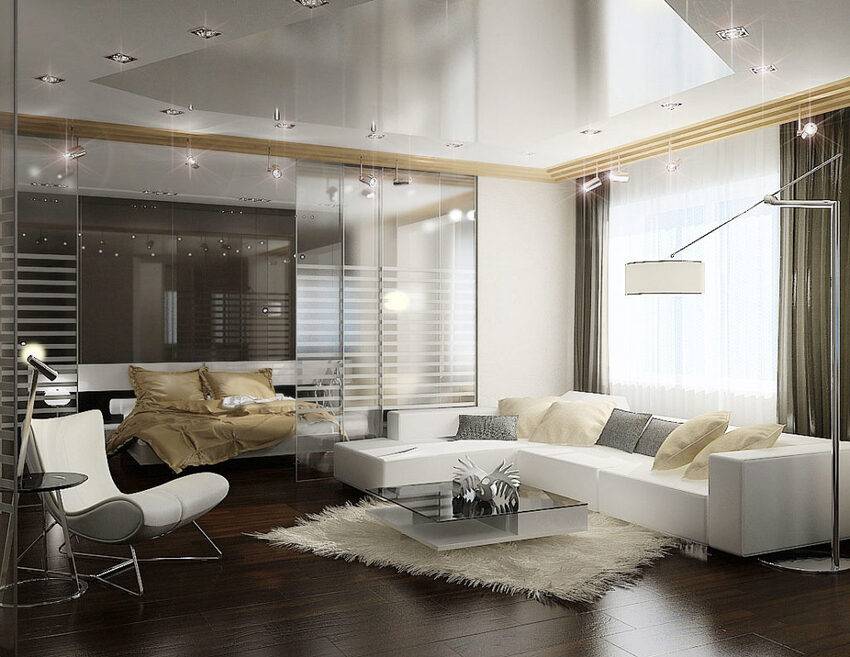 Вариант обустройства спальни с совмещенной спальней и гостиной обычно применяют в однокомнатных квартирах или студиях.