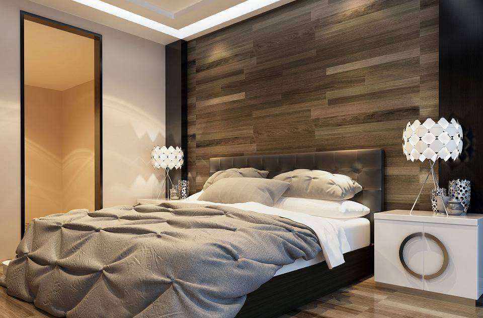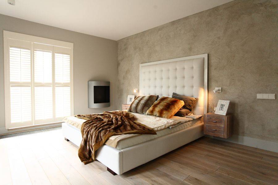 Отделка стен. Подбирая отделку для стен, от ярких оттенков и сочных орнаментов лучше отказаться, и отдать предпочтение обоям или краске нейтральных оттенков. Желательно, чтобы стены были однотонные. Хорошо смотрится в спальне штукатурка, но в этом случае лучше выбирать мелкозернистую, иначе крупная текстура будет визуально скрадывать и утяжелять пространство. Оригинально выглядит отделка одной из стен с помощью деревянных или пробковых панелей. Обычно таким способом выделяется зона с кроватью. Самый стандартный, но не дешёвый вариант — стены под покраску, рассчитывайте на примерно $11 за метр.