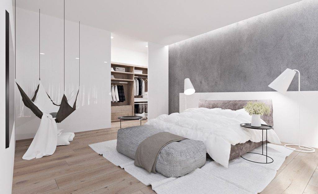 Спальни в стиле хайтек, фото-пример как разбавить монохромный интерьер неброскими акцентами