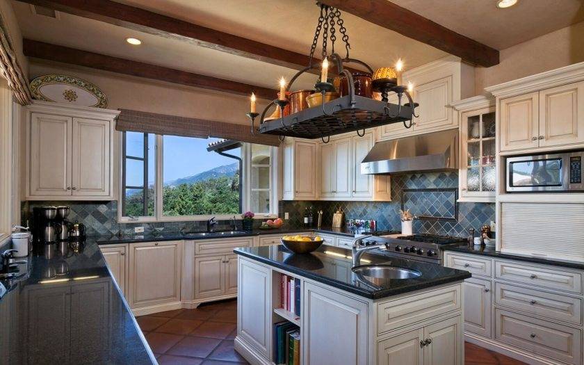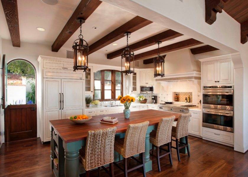 На потолке комнаты могут располагаться массивные деревянные балки. В греческом дизайне они обладают светлым, будто выцветшими на солнце цветом, а в итальянском стиле — тёмно-коричневым. Деревянные балки будут органично смотреться на потолке просторной кухни частного дома. Для квартиры такой вариант не подойдёт, так как балки крадут пространство комнаты, визуально уменьшая её. На фото можно рассмотреть дизайн кухни в средиземноморском стиле с потолочными балками.