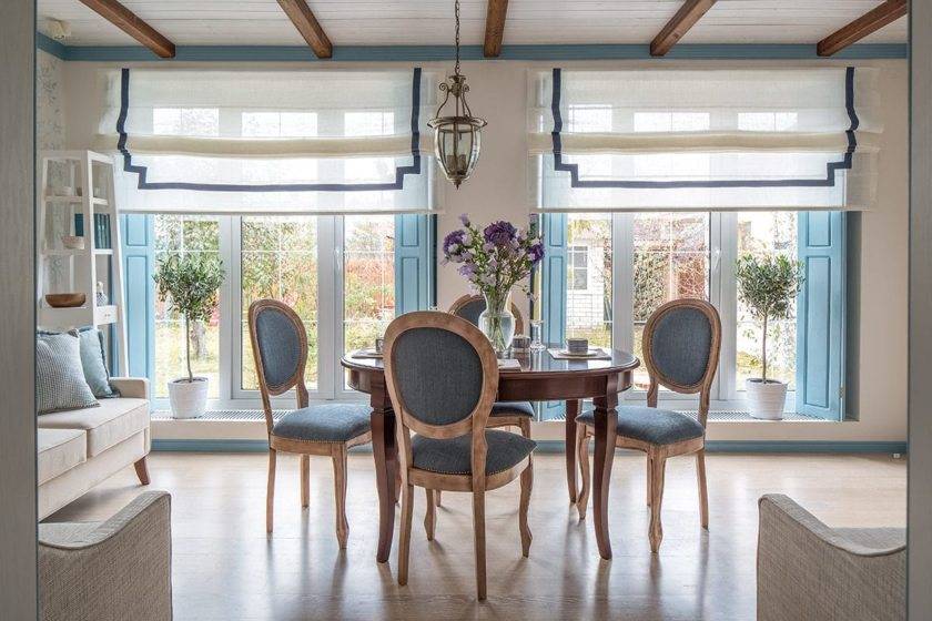 Занавески используются редко, но можно повесить жалюзи из натуральных материалов или тканевые римские шторы.