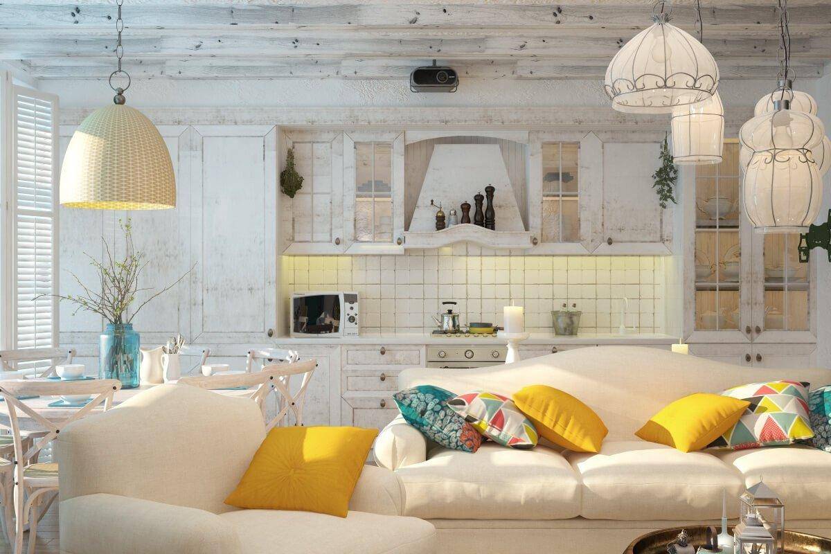 При отделке такой части помещения не может быть и речи о зонировании, допустимо лишь создание острова, который будет разграничивать рабочую и обеденную зоны. В обеденной части непременно должен стоять плетенный или кованый диван с подушками в светлой цветовой палитре. Чтобы подчеркнуть внутреннее убранство необходимо декорировать кухню-гостиную живыми цветами в больших вазонах.