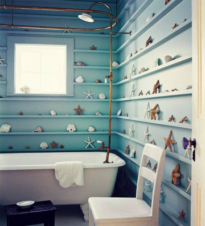 Так можно использовать лёгкие открытые полки, которые будут выполнять и ту, и другую функцию. На них можно разместить различные, соответствующие стилю, предметы. Это могут быть античные вазы, морские раковины.