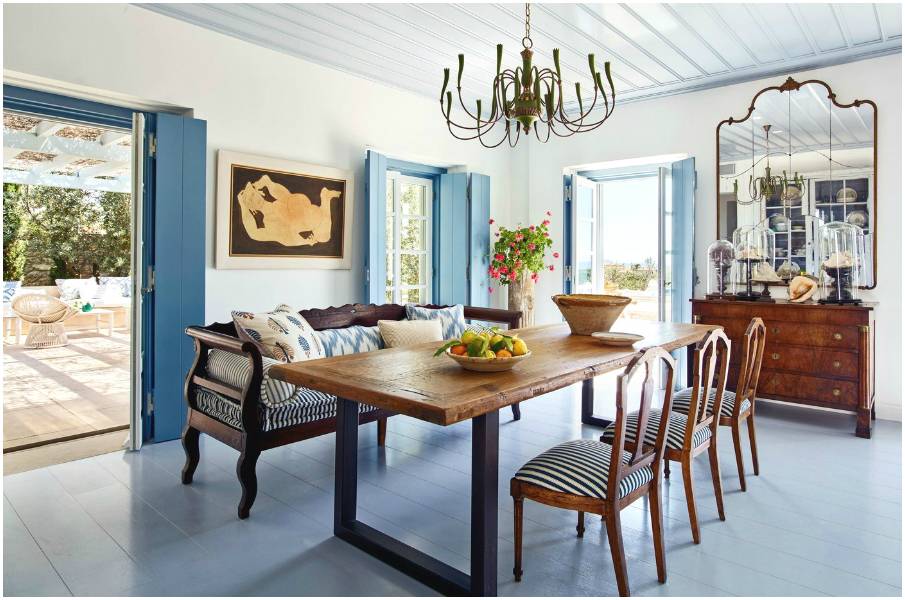 Еще одна особенность греческого жилья — любовь к чередованию оттенков одного цвета в одном предмете. Если подушки синие, то одна светлее, другая темнее. Полосатая стенка — нормально. Даже один шкаф может быть выкрашен в таком ключе, причем все это не будет резать глаз, потому что расположено вполне гармонично.