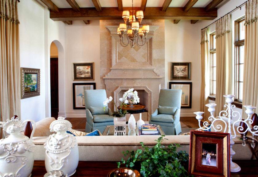 Стены гостиной в средиземноморском стиле можно украсить деревянными рамками с изображениями сельской местности Тосканы или натюрмортами с бутылками вина. Небольшие элементы из кованого железа – дань средиземноморским традициям. Это могут быть основания подсвечников, настенных бра или обрамление зеркал.