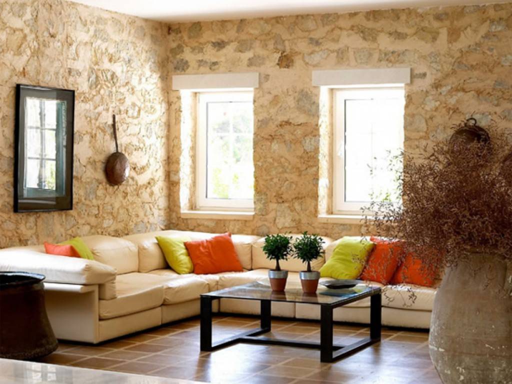 Наличие фактурной отделки позволяет в дальнейшем не использовать другие методы оформления пространства над диваном. Среди таких вариантов применяются: