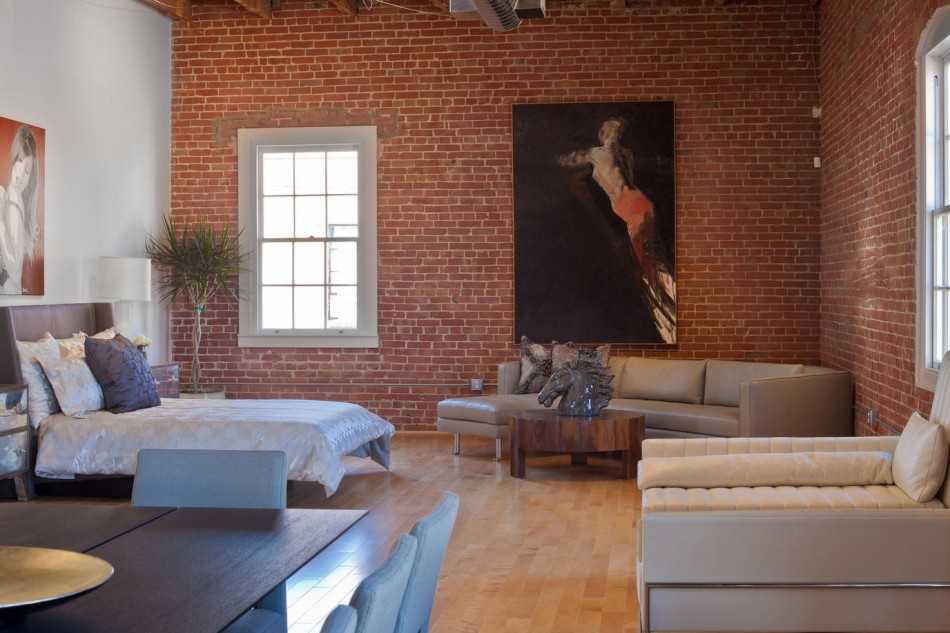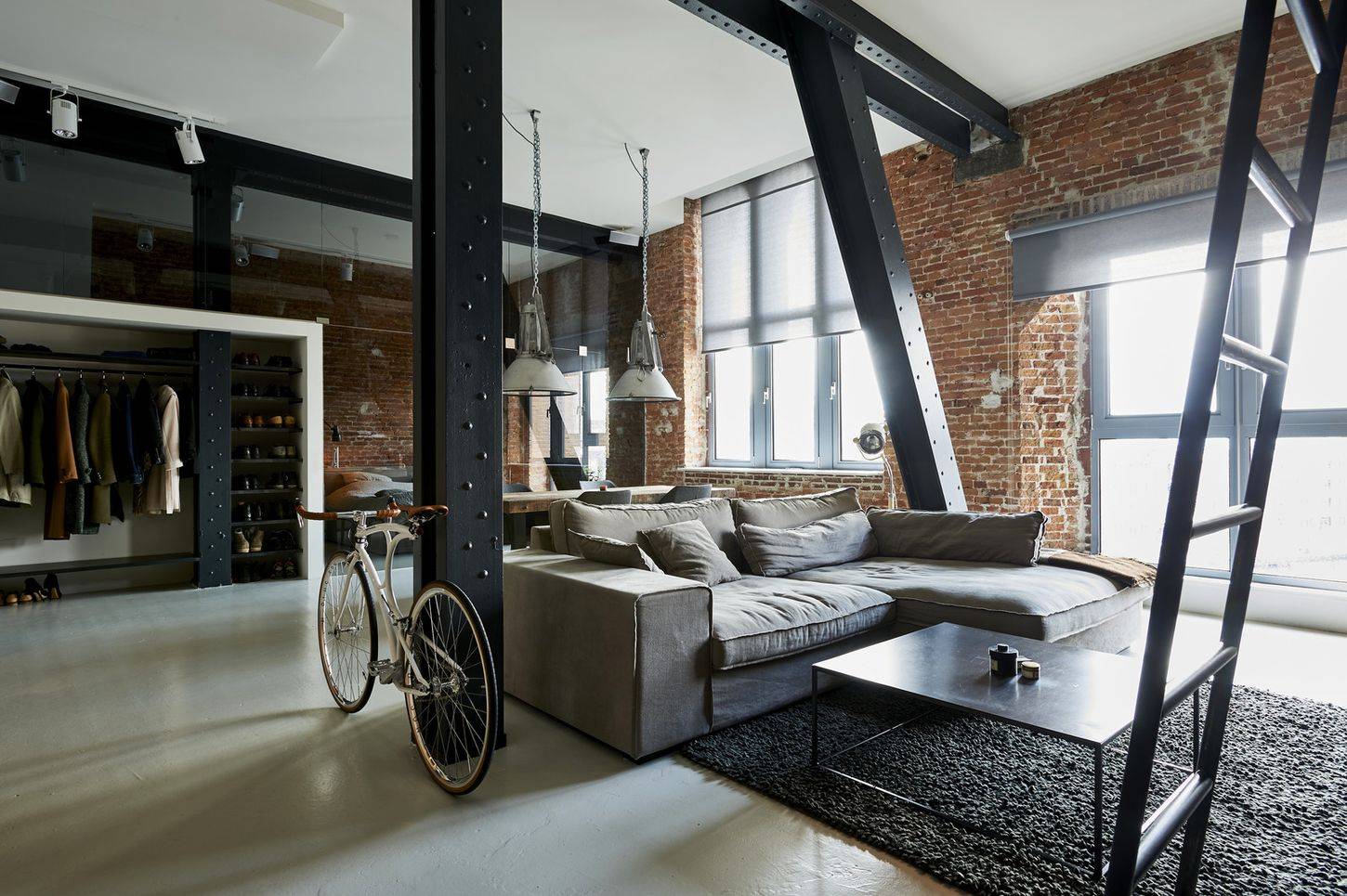 Комфортная мебель. Хотя интерьер в целом напоминает старый цех, для стиля лофт выбираются современные диваны и шкафы, продвинутую технику.