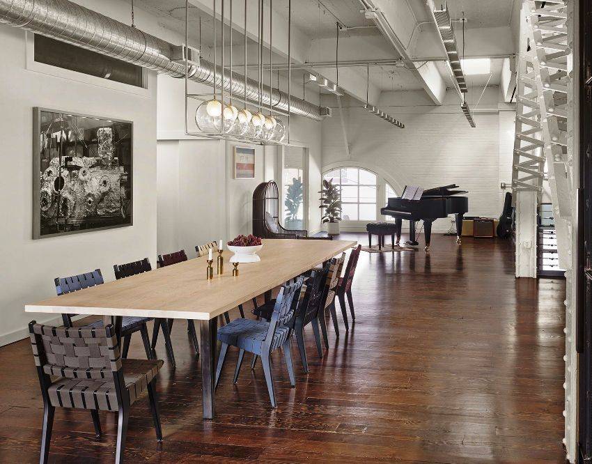 - Большие окна, высокие потолки (преимущественно белые) Под потолком обычно пускают массивные балки, вентиляционные трубы, провода.