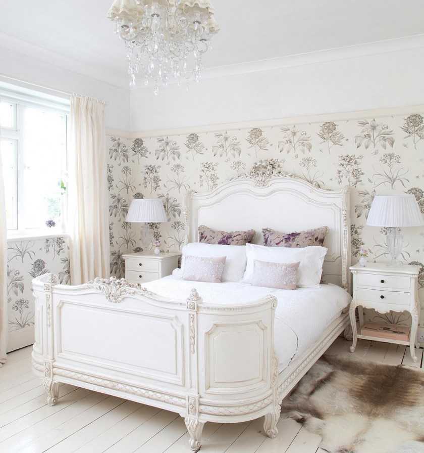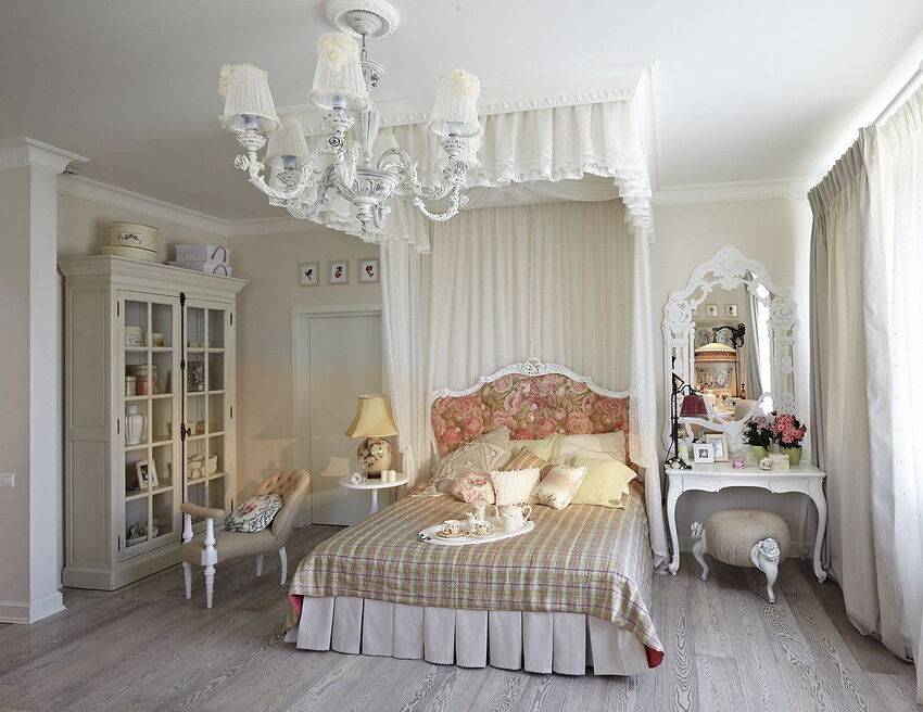 Здесь важную роль играет текстиль: над кроватью вешается элегантный балдахин, постель застилается покрывалом с воланами, рюшами или кружевными вставками. Сверху покрывала укладываются многочисленные декоративные подушки.